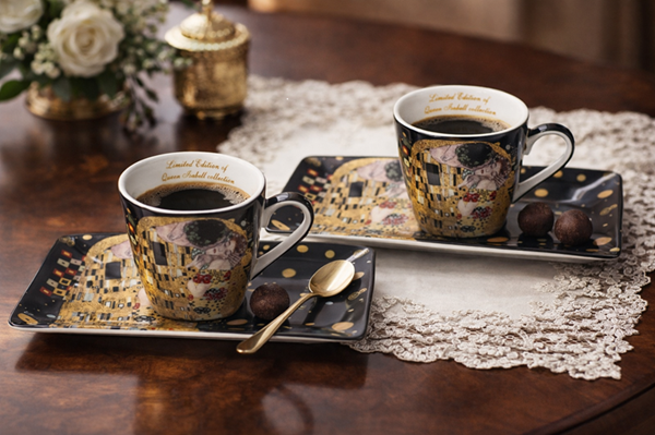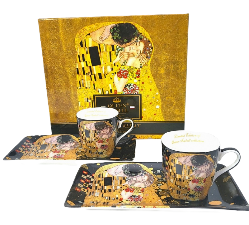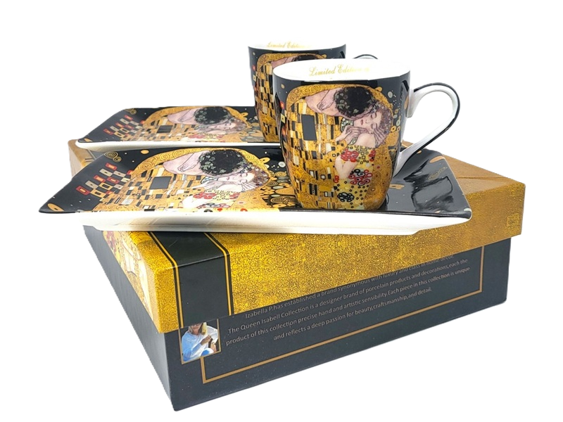 Zapraszamy do zakupu wyjątkowych filiżanek do espresso na przedłużonych podstawkach z łyżeczkami wykonanych z porcelany bone china. Ten gatunek porcelany wyróżnia się swoją delikatnością, trwałością i wyjątkową białością. Wykorzystana w produkcji najwyższ ej jakości kaolina sprawia, że nasze filiżanki są idealnie gładkie i jednocześnie bardzo wytrzymałe. Co więcej, na czarnym tle porcelany znajduje się fragment obrazu Gustava Klimta "Pocałunek", co dodaje naszym filiżankom wyjątkowej elegancji i charakter u. Filiżanki są pakowane w piękne i ozdobne pudełko z tym samym motywem co na porcelanie. To idealny wybór dla miłośników sztuki i dobrej kawy. Dzięki temu, że nasze filiżanki są limitowane, możesz mieć pewność, że twój zestaw będzie unikalny i wyjątkow y. Nie czekaj dłużej, zamów już teraz te niezwykłe filiżanki do espresso na przedłużonych podstawkach z łyżeczkami wykonanych z porcelany bone china i ciesz się wyjątkowym smakiem swojej kawy w stylu. W celu zachowania oryginalnego wzoru oraz złotych zdobień zaleca się mycie ręczne użyciem delikatnego detergentu. Pojemność 1 szt-80ml wymiar 5,5 x 5,5 cm podstawka : 17x9 cm