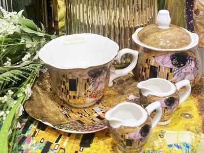 Kubek z przykrywką z metalowym sitkiem wykonany z porcelany Bone China z kolekcji "Klimt" marki Queen Isabell. Zapakowany w prezentowe pudełko, co czyni go idealnym upominkiem.